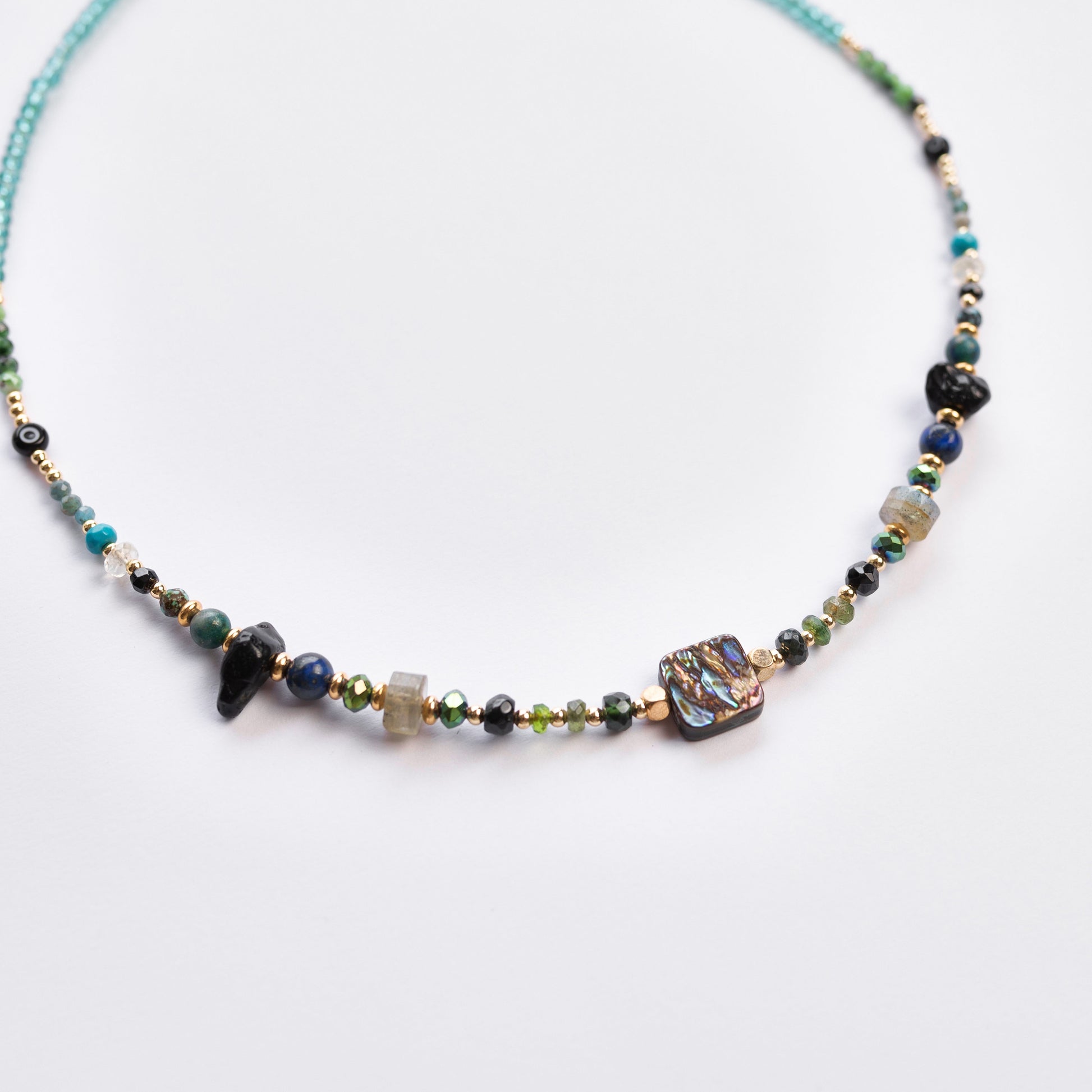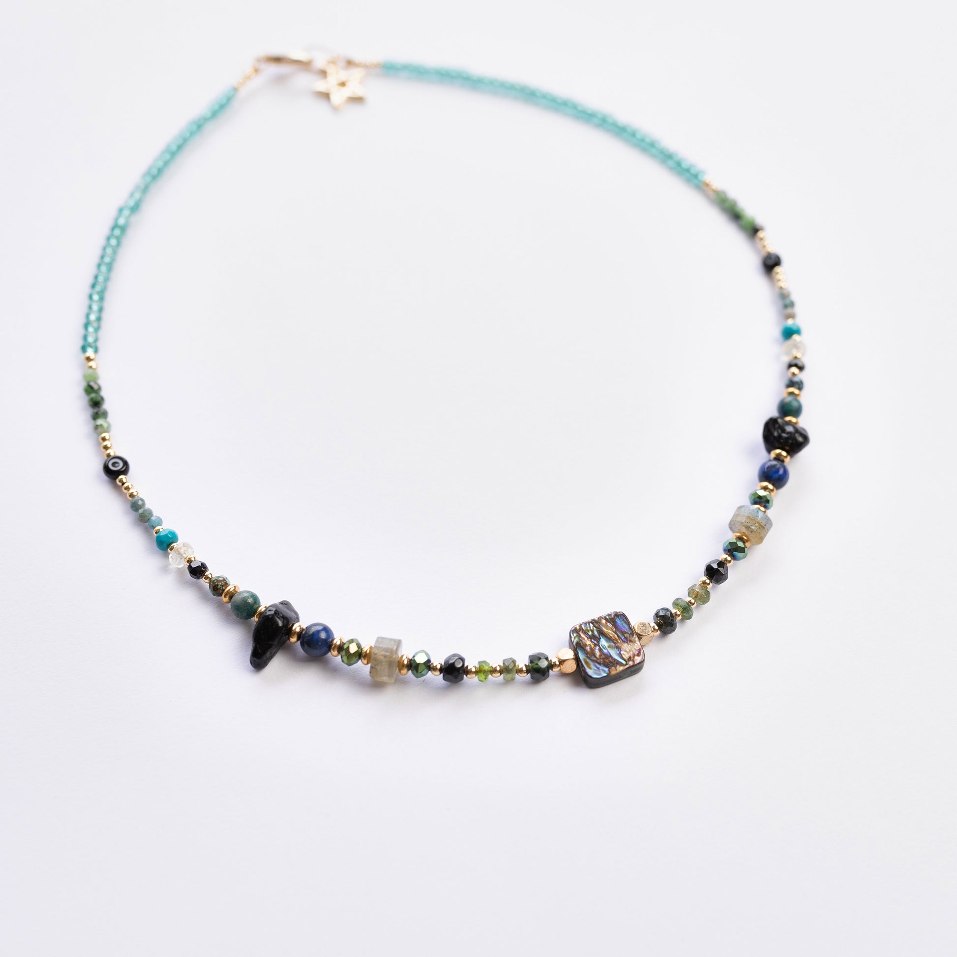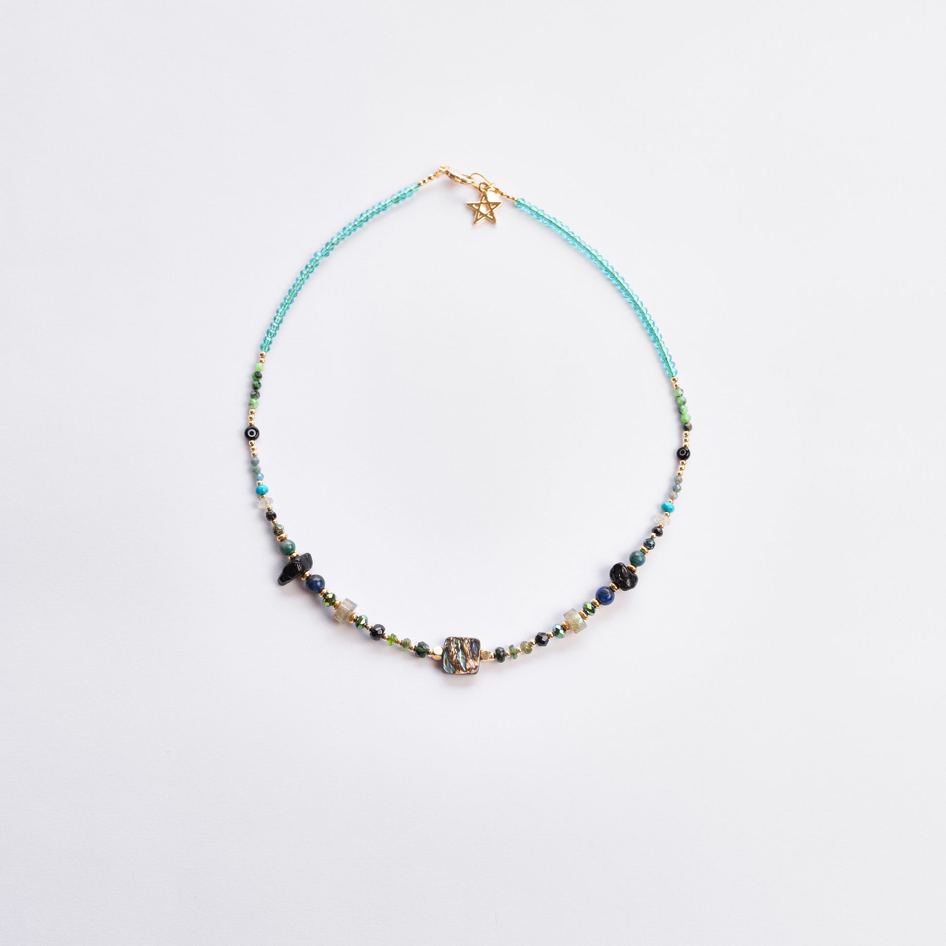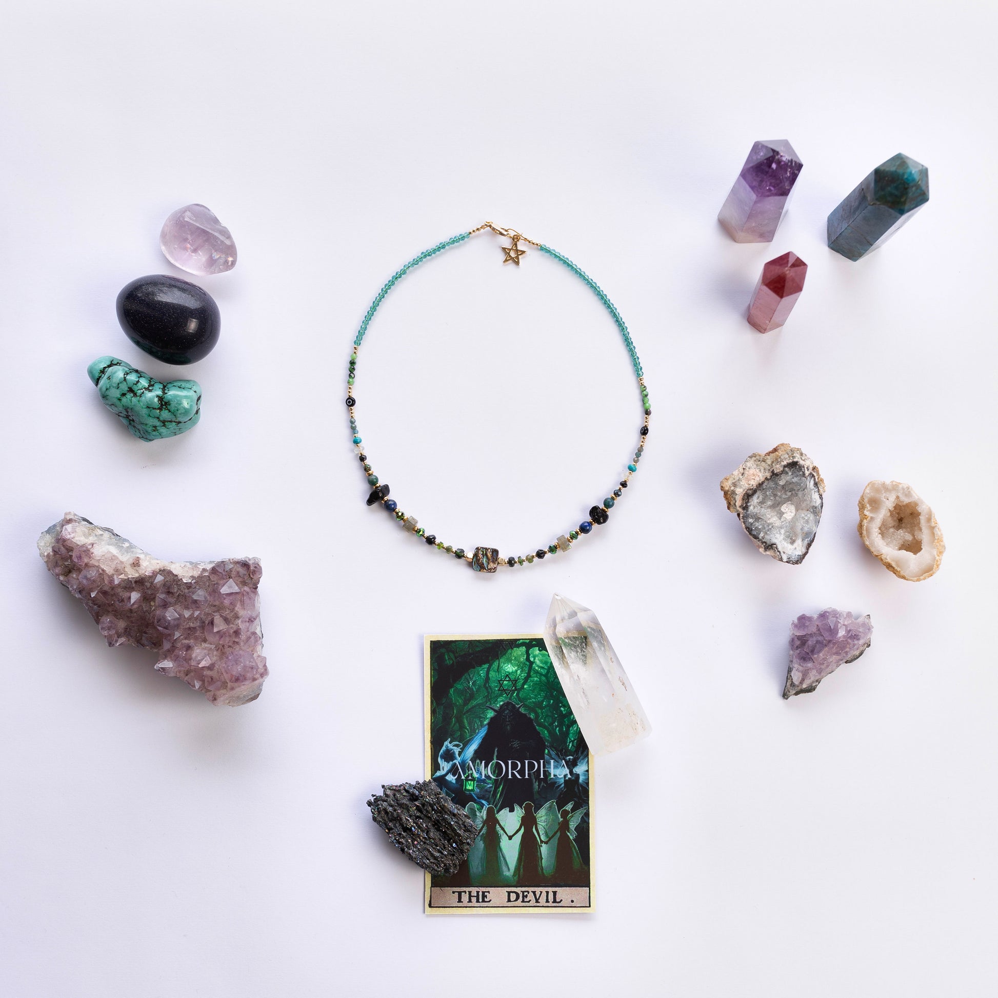Parte de la Colección Tarot AMORPHA. Cada collar es único: las piedras naturales cambian, la intención permanece. Un diseño compartido, muchas formas de llevarlo. Piedras naturales y oro laminado, creado con manos reales y mucho amor. Cada piedra fue elegida por lo que despierta, no solo por su belleza.
