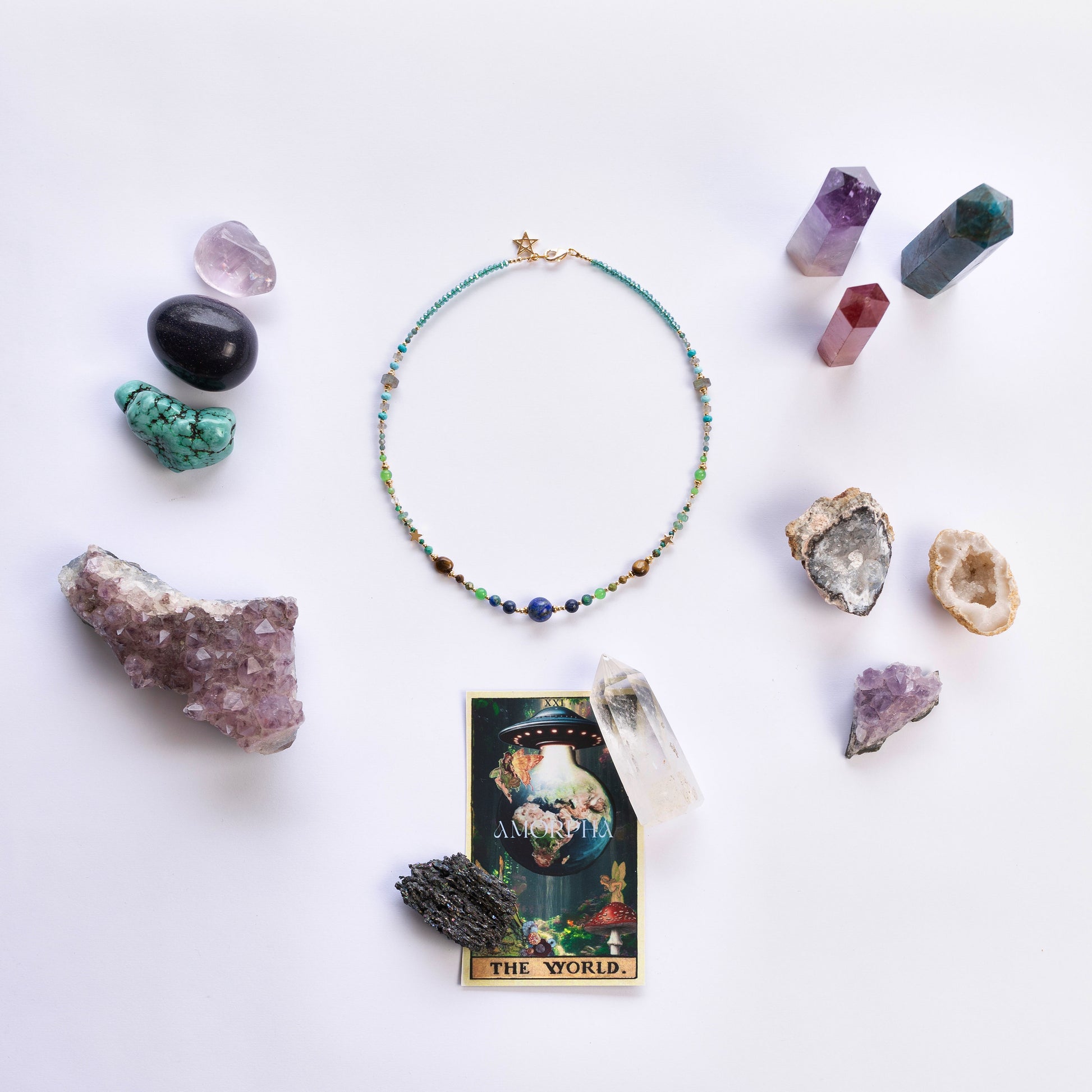 Parte de la Colección Tarot AMORPHA. Cada collar es único: las piedras naturales cambian, la intención permanece. Un diseño, muchas formas de llevarlo. Piedras naturales y oro laminado, creado con manos reales y mucho amor. Cada piedra fue elegida por lo que despierta, no solo por su belleza.