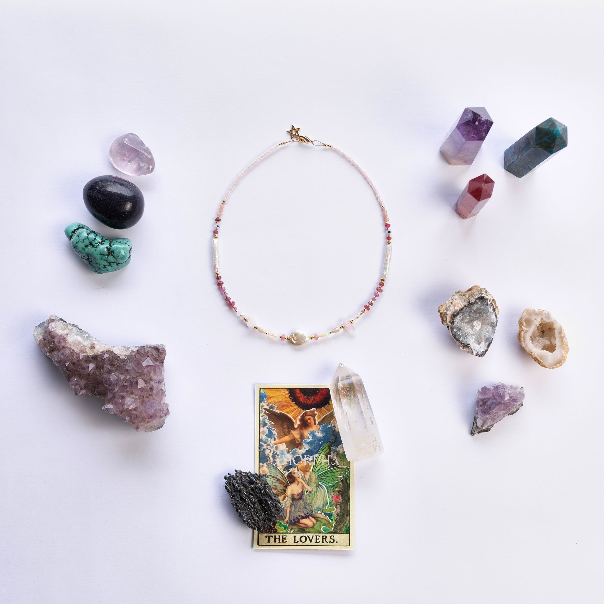 Parte de la Colección Tarot AMORPHA. Cada collar es único: las piedras naturales cambian, la intención permanece. Un diseño, muchas formas de llevarlo. Piedras naturales y oro laminado, creado con manos reales y mucho amor. Cada piedra fue elegida por lo que despierta, no solo por su belleza.