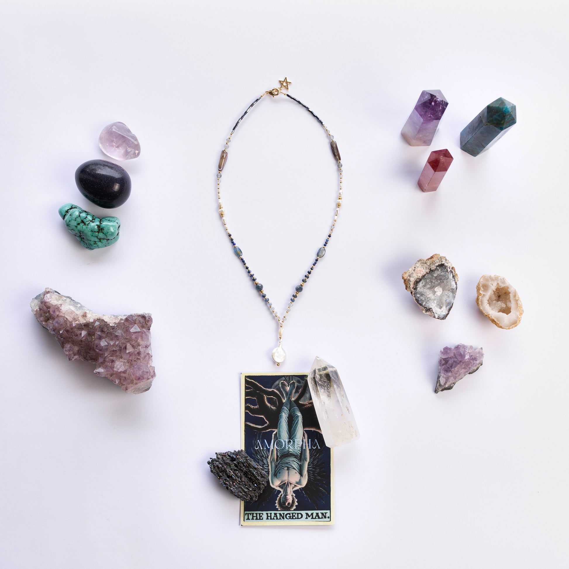 Parte de la Colección Tarot AMORPHA. Cada collar es único: las piedras naturales cambian, la intención permanece. Un diseño, muchas formas de llevarlo. Piedras naturales y oro laminado, creado con manos reales y mucho amor. Cada piedra fue elegida por lo que despierta, no solo por su belleza.