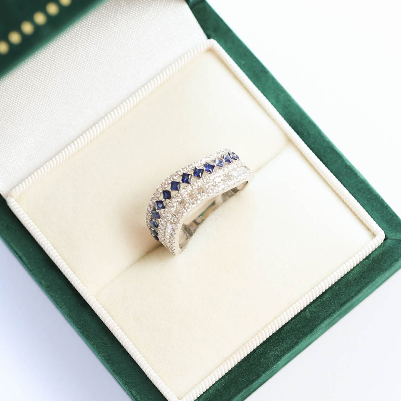 El anillo SAPHIRE & DIAMOND WAVES traduce en metal el vaivén de quien avanza con calma y propósito.
