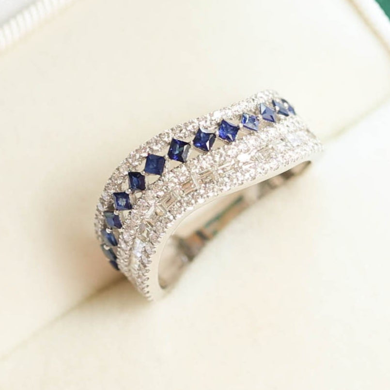 Zafiros que hablan de intuición lucida, diamantes que sostienen una luz firme; todo montado en oro blanco que ondula como marea serena, una fuerza que guía.